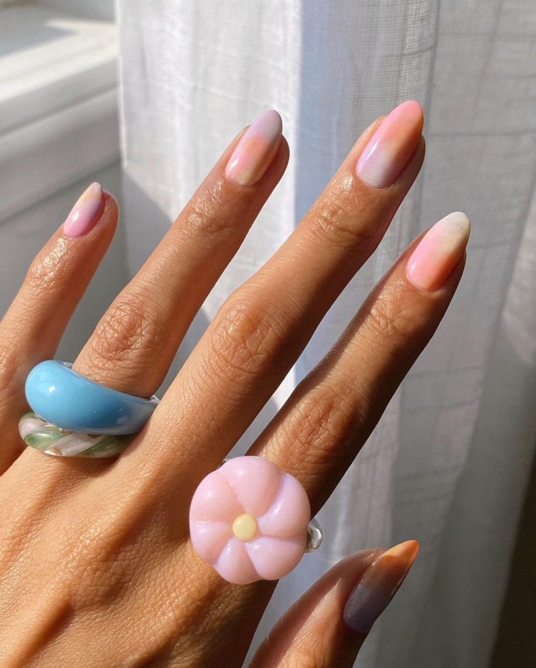 Телесный маникюр, столь популярный в период пандемии, постепенно отходит на второй план. В тренде нежные пастельные оттенки: розовый, персиковый, лимонный. Такой лак – переходный вариант для тех, кто еще не готов к ярким цветам на ногтях.