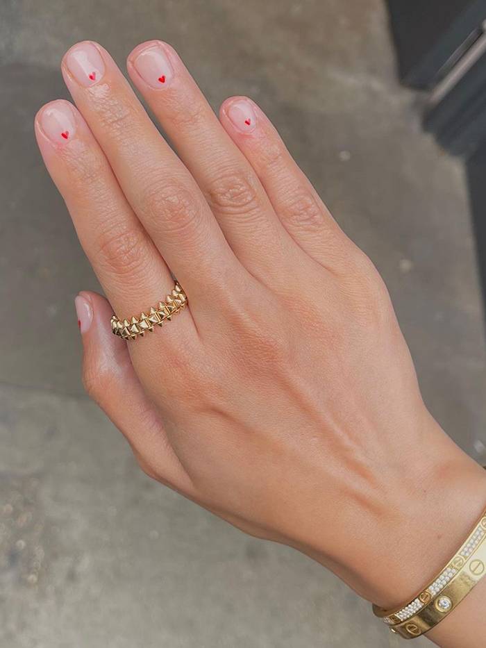 Это разновидность минималистичного маникюра: мастер покрывает ногтевую пластину прозрачным лаком и добавляет какую-то лаконичную деталь, рисунок от руки или наклейку: микросердечки, цветы, звезды или просто точки.