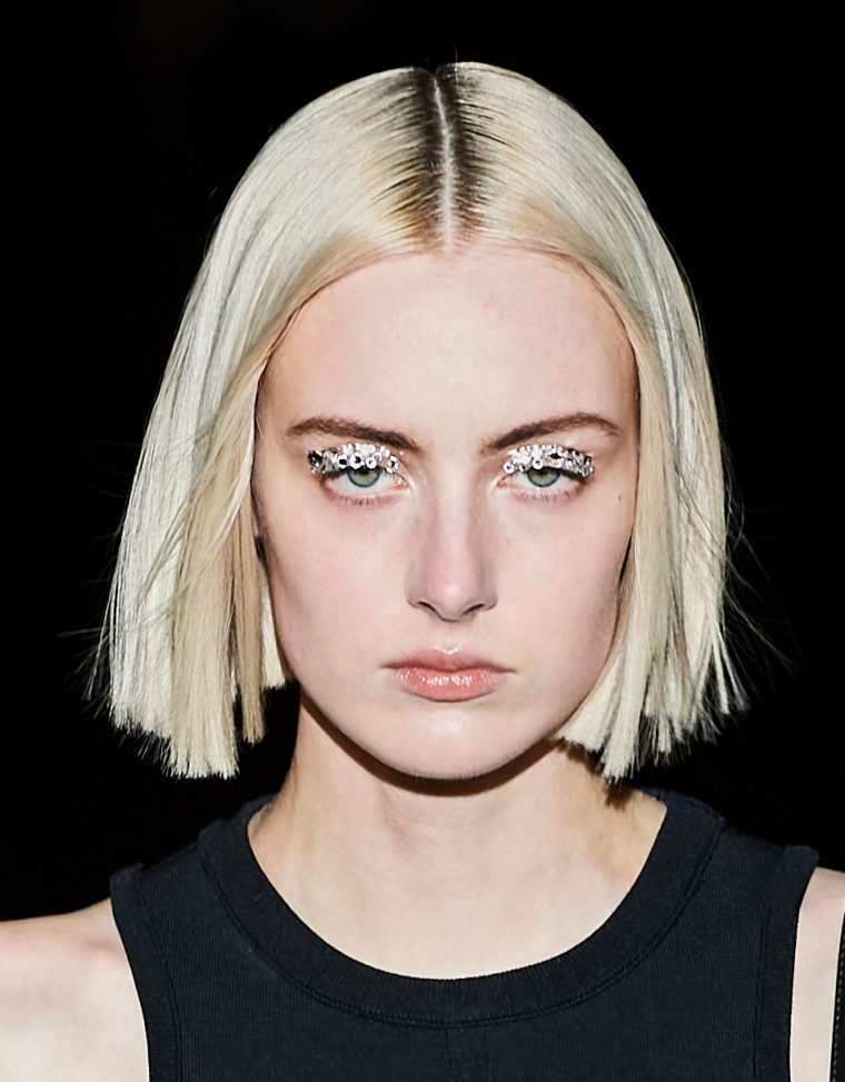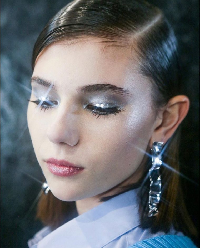 На показе Prada визажист Лючия Пика одно веко модели выделила золотыми тенями, а второе – серебряными. Благородный металл всегда смотрится празднично. Ей вторит и визажист шоу Coperni Фара Хомиди: она наклеила моделям на подвижное веко настоящие стразы. Отличные идеи для тех, кто соскучился по макияжу в стиле «оторваться по полной».