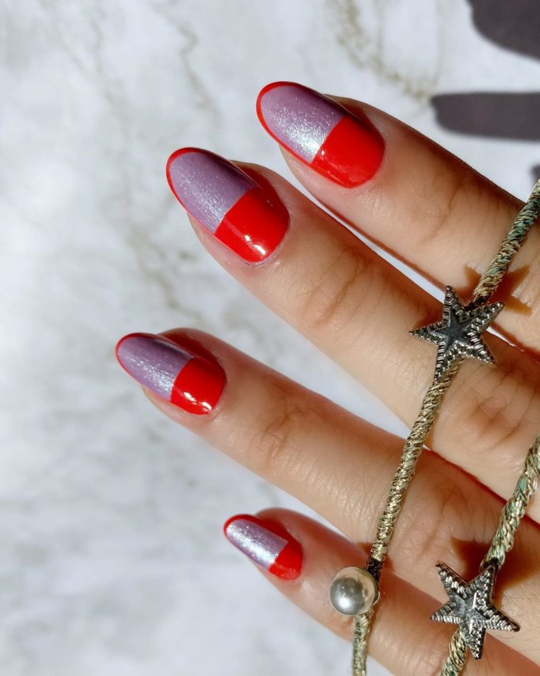 Настоящее спасение для тех, кто никак не может определиться с цветом. Теперь и не нужно: в списке трендов маникюр «колорблок» – на одном ногте мастер комбинирует два контрастных оттенка. Например, красный и розовый, как на показе Tadashi Shoji.