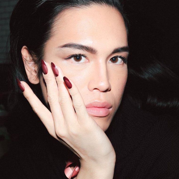 Согревающий оттенок глинтвейна – традиционный осенний цвет. Он был на ногтях моделей на показах Versace, Etro, Marine Serre. Если он все-таки кажется вам скучноватым, попросите мастера сделать маникюр, как на шоу Prabal Gurung, когда вся ногтевая пластина покрыта матовым топом, а кончик и лунка – глянцевым.