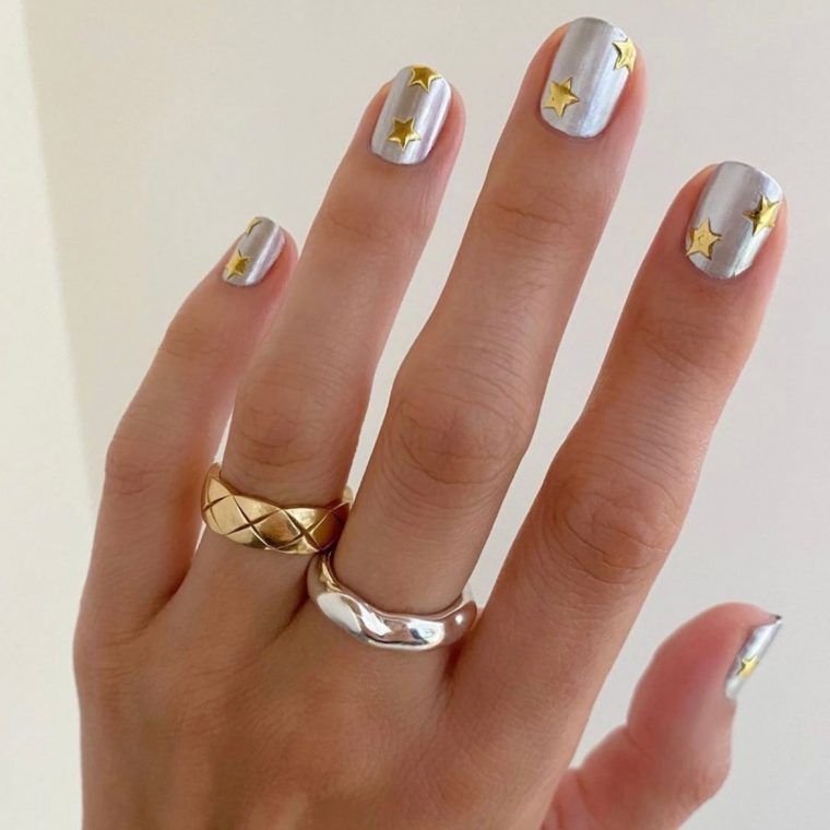 Настроение диско, присущее «нулевым», царит и в осенних коллекциях, и в маникюре. Актуальны металлические оттенки – серебро, золото, бронза. Это может быть блестящий лак с шиммером или крупные блестки. Если полностью покрытые блеском ногти кажутся вам слишком праздничными, сделайте французский маникюр – нюдовая база и золотые или серебряные кончики, как на шоу Rebecca Minkoff.
