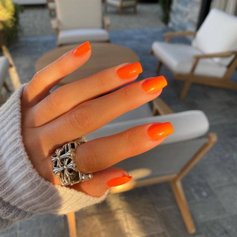 Тренд задала Кайли Дженнер, регулярно демонстрируя в инстаграме свой маникюр тыквенного оттенка. Кайли попробовала все варианты: и очень длинные, полупрозрачные оранжевые ногти, и нейл-арт в апельсиновых тонах, и французский маникюр с ярким кончиком. Самое то в преддверии Хэллоуина!