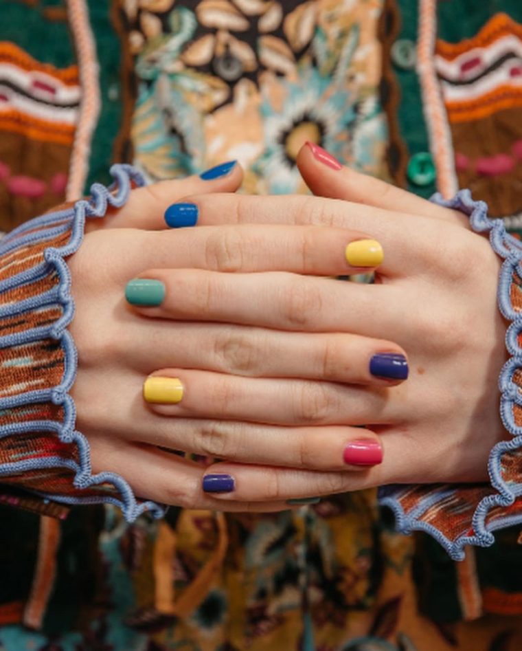 Цвета могут быть из одной гаммы, например пастельной. Или же, как говорит известный голливудский нейл-мастер Симча Уайтхилл, «те пять цветов, которые вы любите». Так, для презентации Missoni она смешала в одном маникюре синий, желтый, розовый, фиолетовый и зеленый.