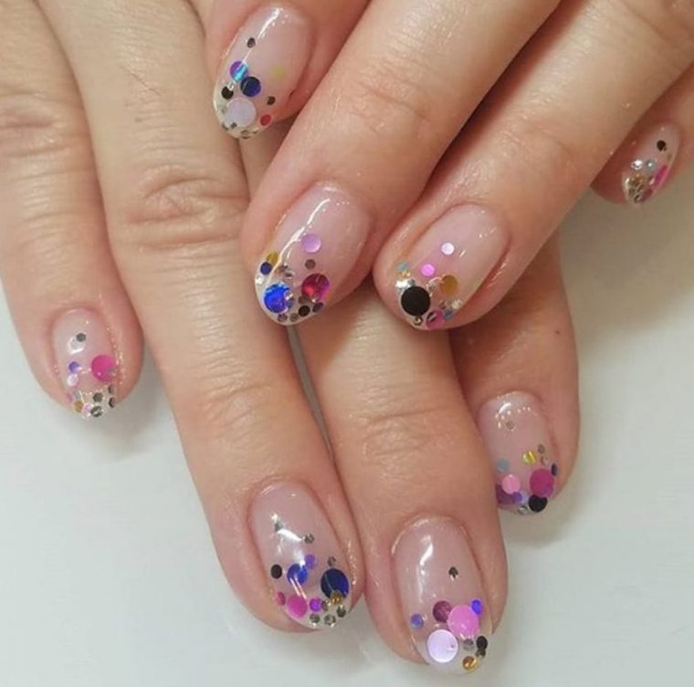 Мастер покрывает ногтевую пластину прозрачным лаком, а поверх точечно наносит блестки, в результате чего они напоминают яркое разбросанное конфетти.