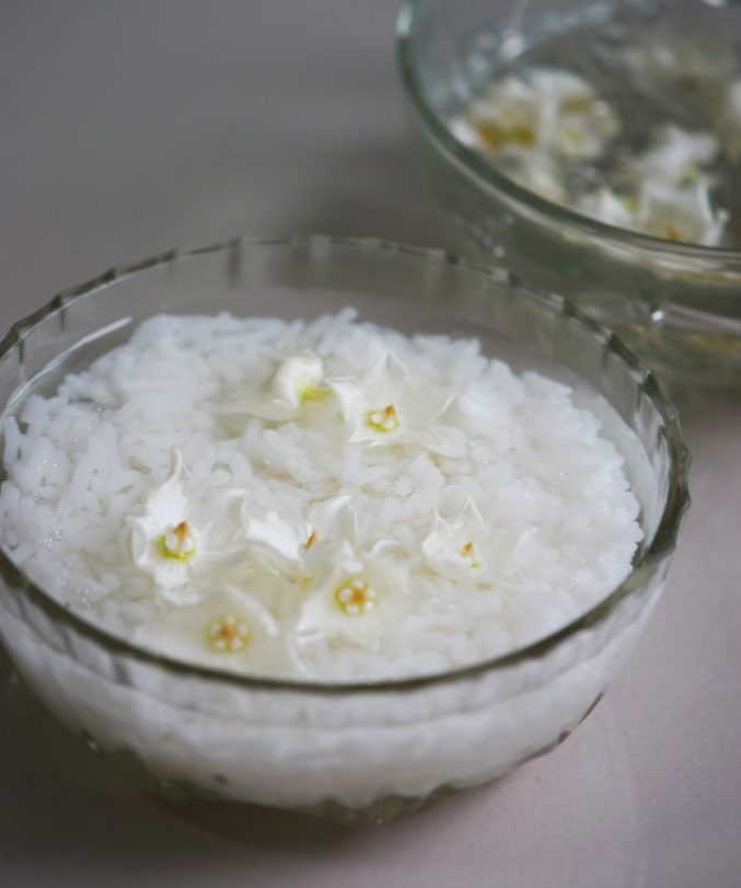 - Поместите чистый рис в миску и добавьте воду. Дайте настояться не менее 8 часов (лучше оставить на сутки).