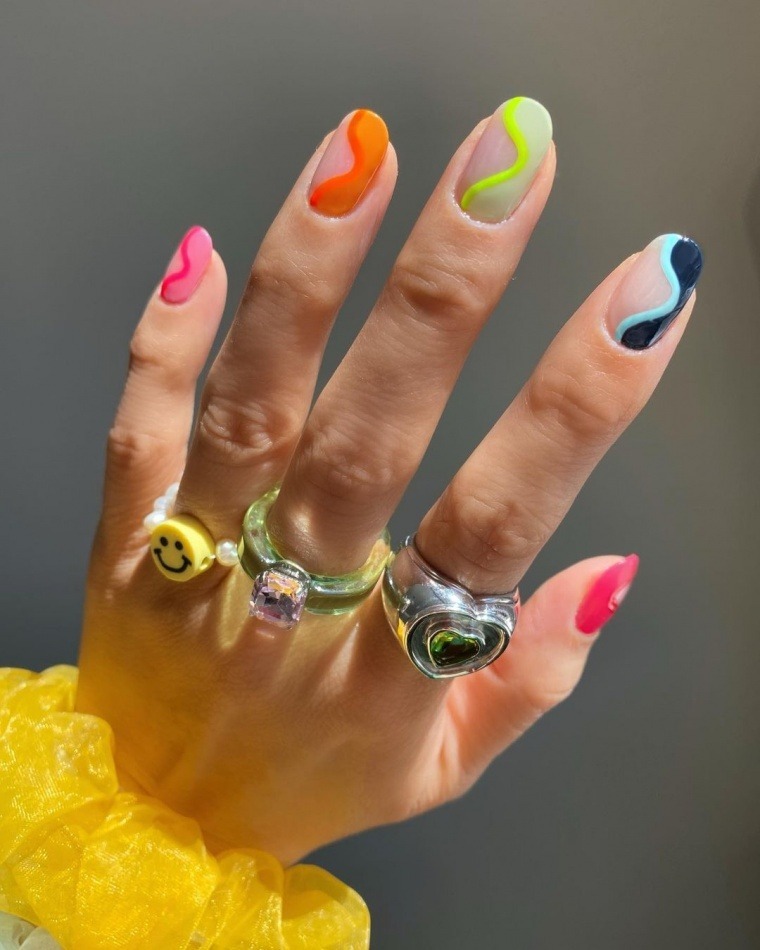 Еще один популярный рисунок на ногтях – волна. Эта идея родилась на карантине, когда хотелось чего-то необычного, а ровных линий самостоятельно сделать не получалось. Так и появился абстрактный нейл-арт с различными волнами и завитушками, горизонтальными и вертикальными, ярких оттенков: зеленые, синие оранжевые, розовые.
