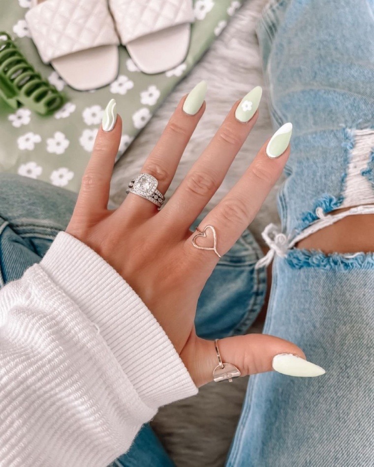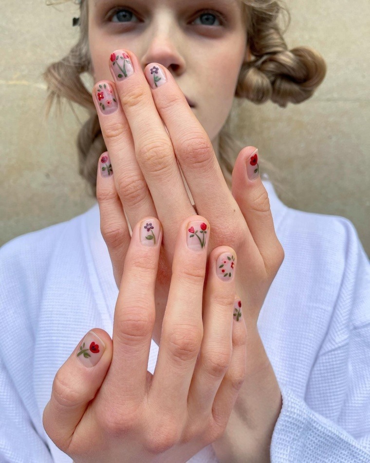 Если цветочный принт на платьях вам кажется банальным, попробуйте примерить его на ногтях. Попросите мастера нарисовать незатейливые ромашки или использовать наклейки более сложных экзотических бутонов.