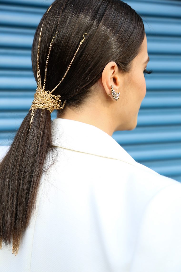 Разделите волосы на прямой или асимметричный пробор и завяжите хвост ниже затылка. Обязательно украсьте прическу лентой, бархатной резинкой, бантом или даже специальным аксессуаром из множества цепочек. «Кстати, теперь низкий хвост завязывать можно на волосах любой длины, даже если у вас каре, как это было на показе Jil Sander», – говорит Ольга Мартыненко.