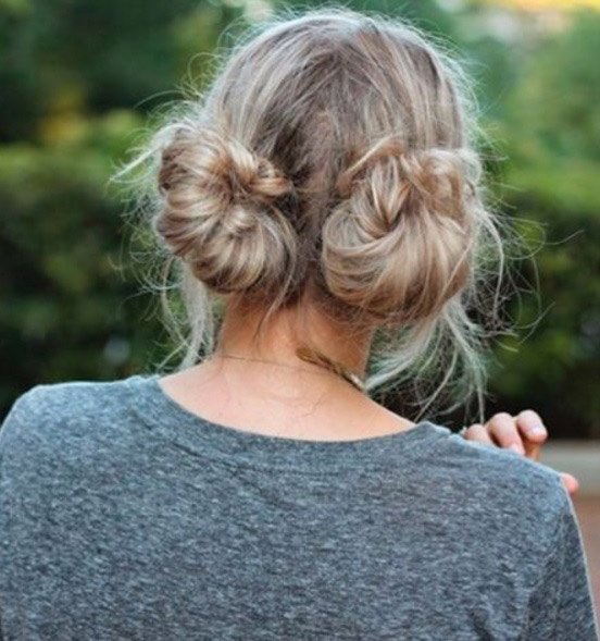 Если прическа в стиле «ушки на макушке» кажется вам все-таки больше подходящей дочери Ким Кардашьян Норт, есть и другой ее вариант – скрутите два низких пучка на затылке.