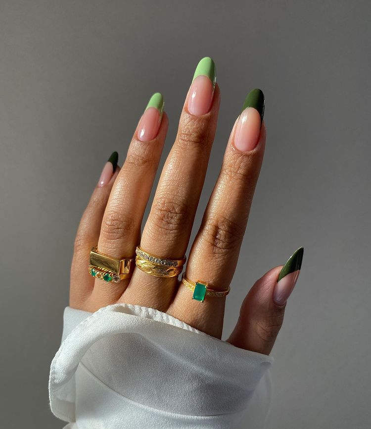 Или же внедрить зеленый во французский маникюр, используя любимый тон на кончиках ногтей вместо белого, а ногтевую пластину, как и всегда, оставить телесно-розовой.