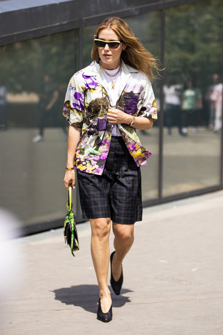 Посмотрите на популярного скандинавского блогера Аннабель Розендахл – клетчатые шорты она надела с простой белой футболкой, а сверху накинула цветастую рубашку – как жакет. А еще добавила остромодных аксессуаров – туфли с тупым мысом, яркую сумочку и очки-маску.