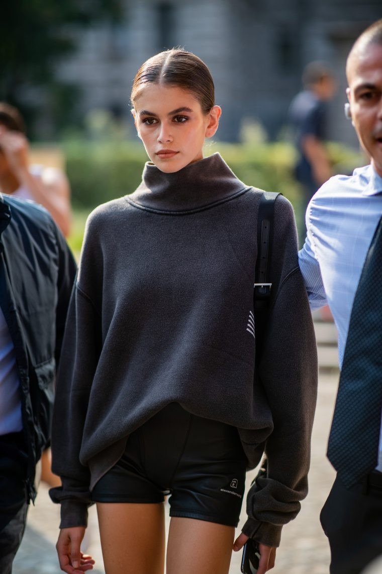 Актуальный образ в стиле «не успела переодеться после спортзала». Кайя Гербер выбирает верх и низ в одном тоне, а свитшот должен быть обязательно оверсайз – так ноги будут выглядеть еще стройнее.