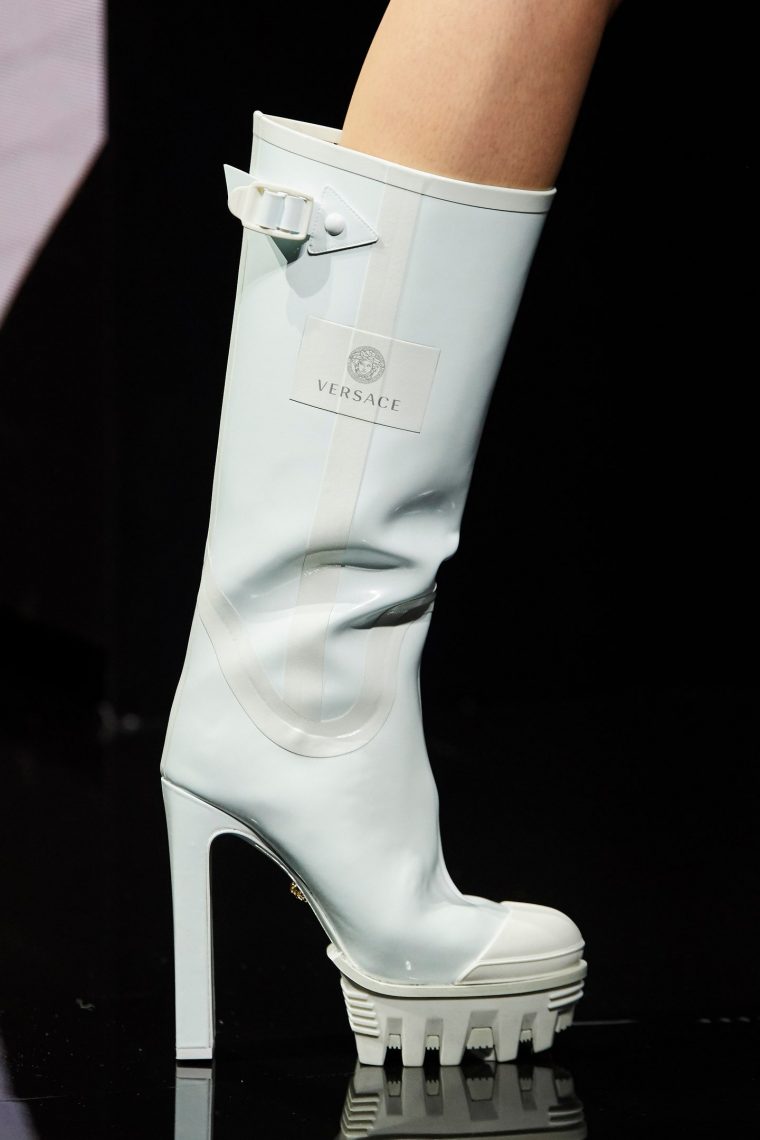 Prada, Versace, Bottega Veneta и Dior позаботились о том, чтобы мы шлепали по лужам красиво: резиновые сапоги обзавелись шнуровкой, «тракторной» подошвой и даже высокой шпилькой. С такими деталями носить резиновые сапоги можно с чем угодно, даже с летящим платьем.