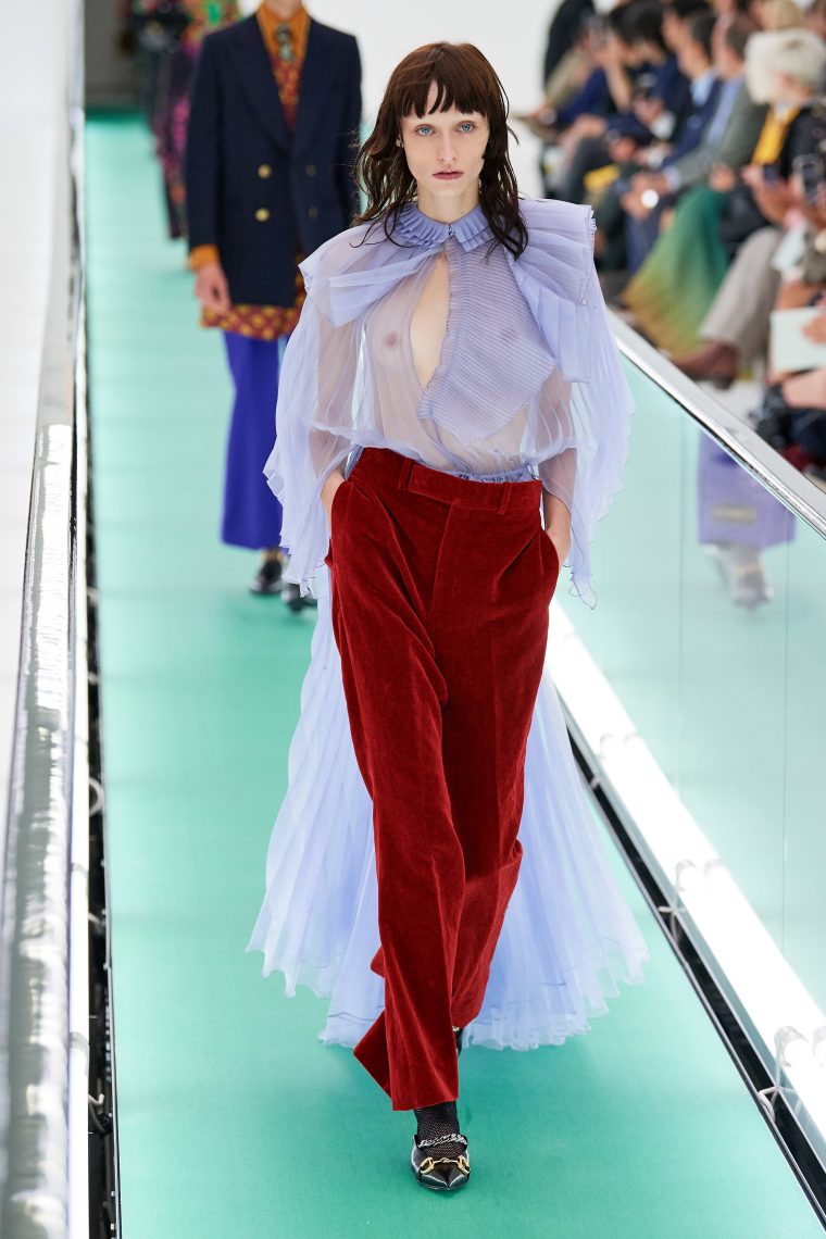 Одним из самых популярных нарядов на показах были полностью прозрачные платья. Такие смелые эксперименты и правда можно оставить на весну, а сейчас под полупрозрачную рубашку в мужском стиле или блузку с бантом наденьте водолазку или накиньте сверху жакет.