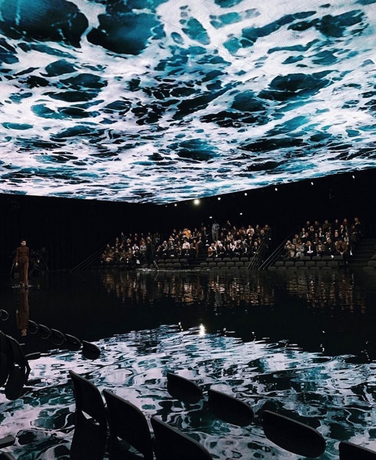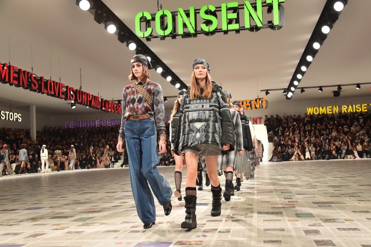 Dior же продолжает тему феминизма и экологии: организацию пространства в саду Тюильри доверили художникам-неоконцептуалистам Фульвии Карневале и Джеймсу Торнхиллу. Они выложили подиум копиями газет Le Monde, а также развесили светящиеся буквы, складывающиеся в короткие лозунги. Например, «Патриархат = Чрезвычайная климатическая ситуация» или «Женщина – Луна, управляющая приливами».