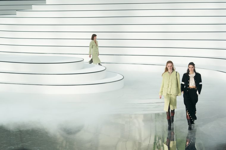 А вот марка Chanel, чей сет-дизайн в Гран-Пале обычно поражал воображение гигантскими декорациями, на этот раз ограничилась минималистичным зеркальным подиумом, зато с эффектной дымовой завесой.