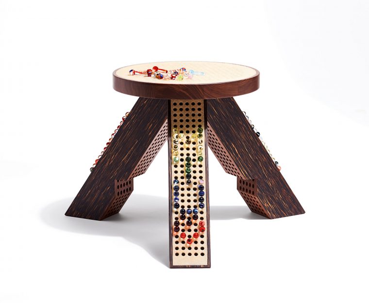 Табурет выполнен из грецкого ореха, облицованного пальмовым деревом, у него каучуковое сидение и ножки с отверстиями-перфорацией. В них-то и вставляются «спички» с разноцветными головками-стекляшками. Их можно комбинировать как угодно, создавая новые оригинальные рисунки хоть каждый день.