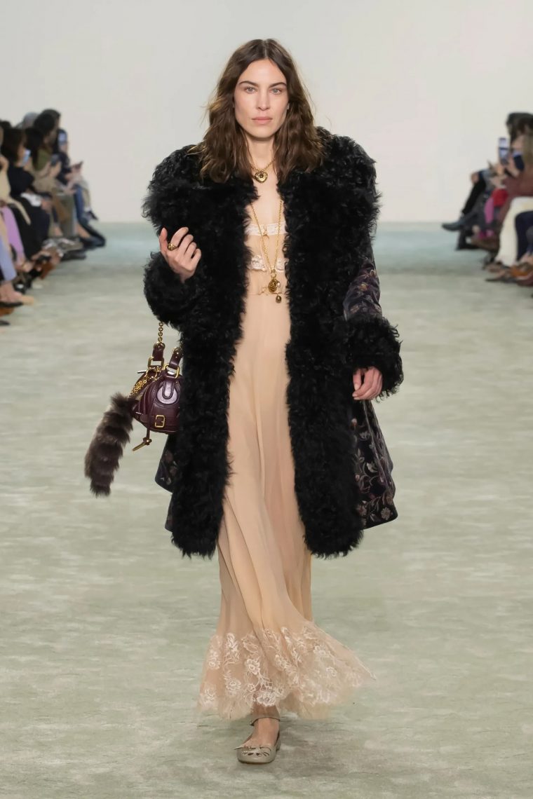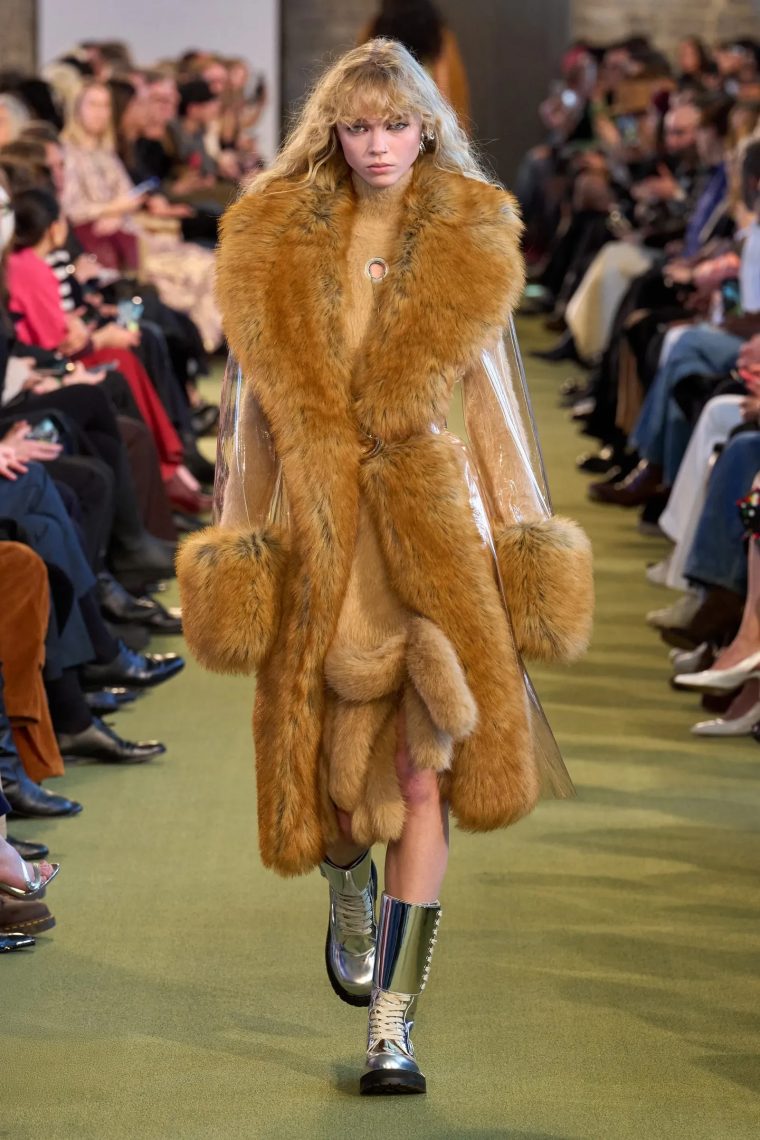 В сезоне осень-зима 2025/2026 приталенные пальто из овчины длиной до колена или чуть ниже, щедро отделанные на вороте, манжетах и вдоль планки с застежкой длинным «кудрявым» мехом, были замечены на показах Chloé, Rabanne, Acne Studios, Zimmermann, Patou, Attico и других брендов.