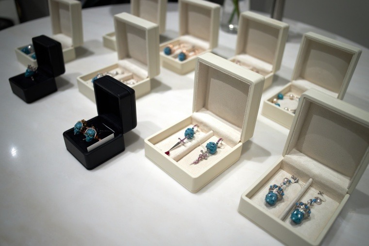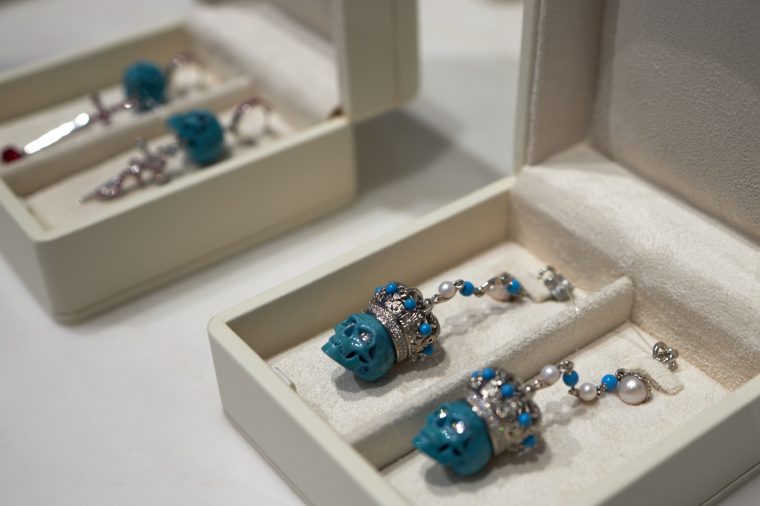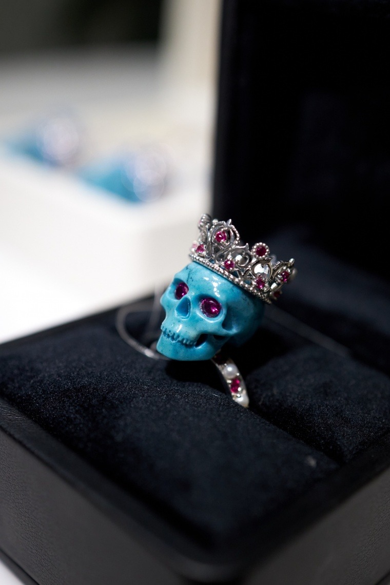 Девушки с удовольствием примеряли серьги и кольца в виде черепов с коронами из жемчуга и шпинели, наушниками из янтаря.