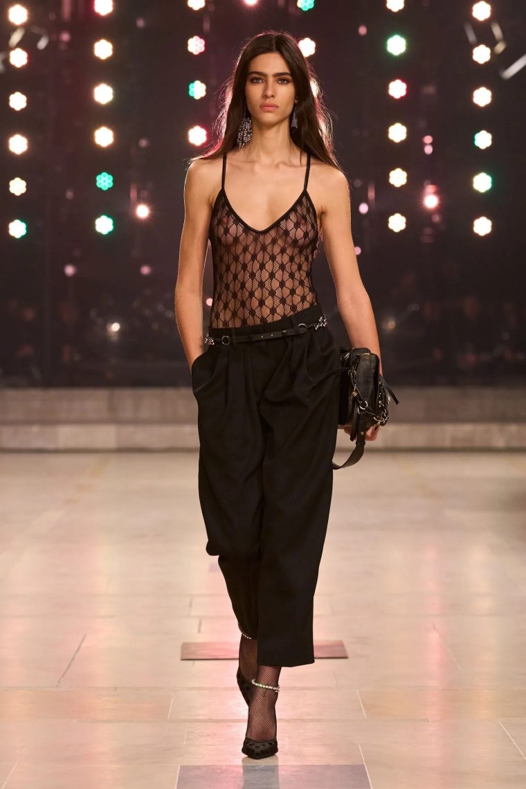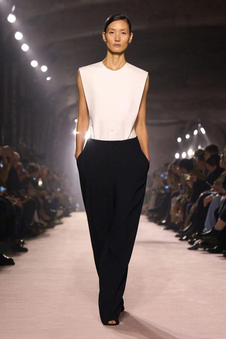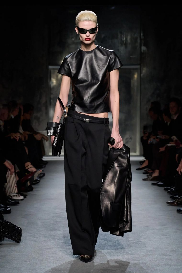Помимо всевозможных коктейльных платьев на показах сезона осень-зима 2025/2026 было популярно сочетание брюк от костюма с нарядным топом – с вырезами, драпировками, из кружева или шелка.