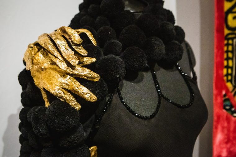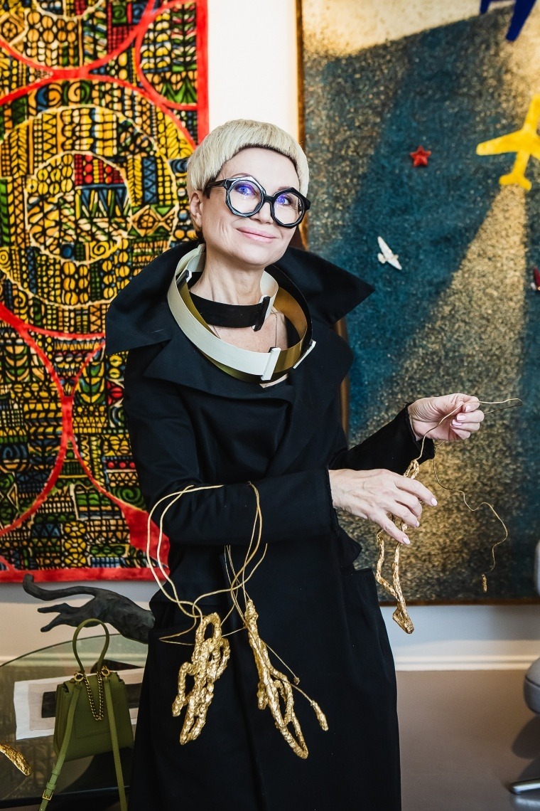 Все приглашенные стали участниками арт-перфоманса, примерив массивные украшения, созданные Лорой. Особо выигрышно украшения-«скульптуры» смотрелись на гостях, одетых в черное.