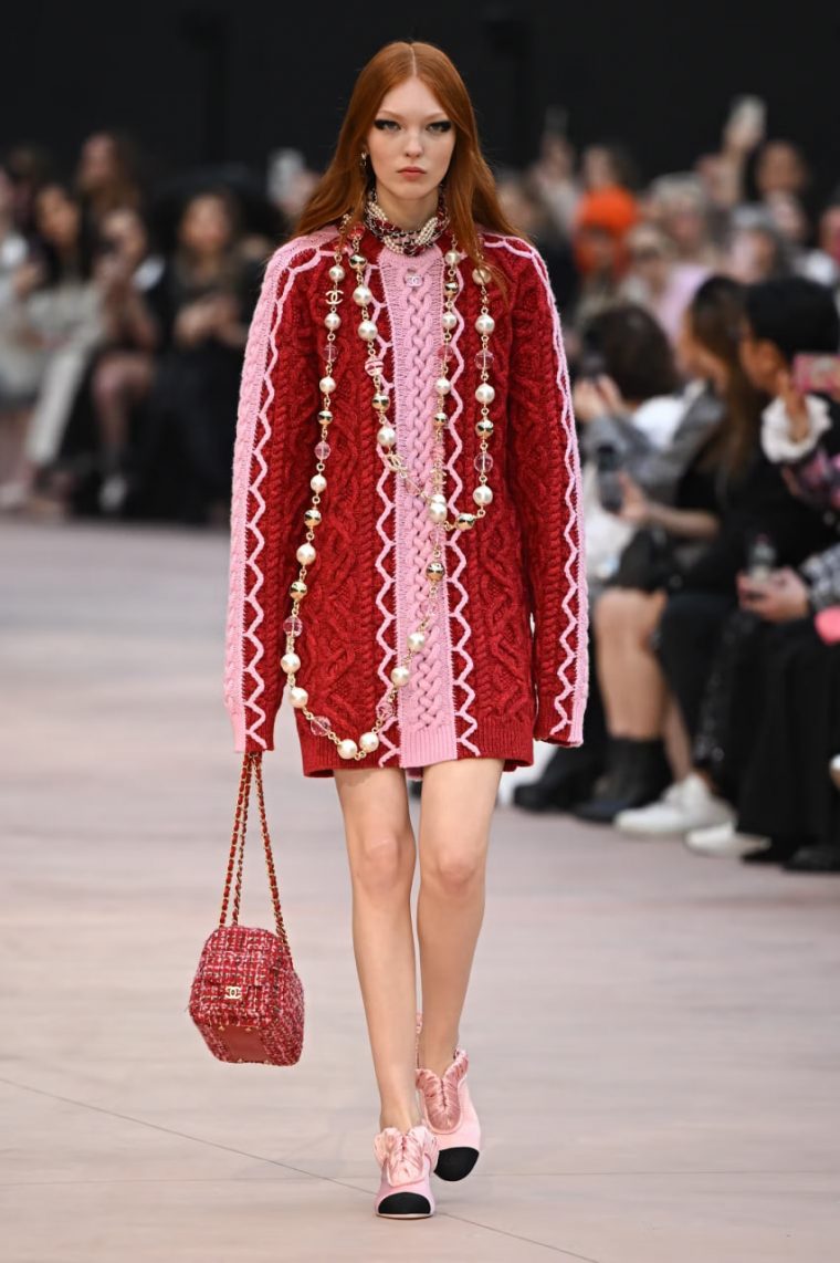Платье-свитер длиной до середины бедра было представлено во многих коллекциях осень-зима 2025/2026. Особенно отличились Chanel: на подиуме мы видели и мятно-зеленое, и конфетно-розовое, и в ажурную полоску, и с гигантским бантом.