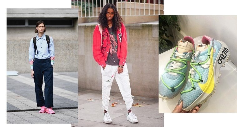 Что касается ассортимента спортивных гигантов, то адидасовские новинки этого года Falcon и YUNG-1, безусловно, были популярны среди блогеров и редакторов. Но все же немного меркли в тени коллабораций Nike – «Джорданов» и модели Blazer из совместной коллекции с Off-White, а также ярких неоновых кроссовок от Comme des Garcons.