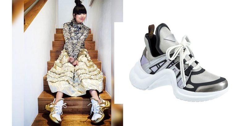 В легких футуристичных кроссовках Louis Vuitton Archilight была замечена блогер Сьюзи Бабл. Англичанка выбрала бело-золотую модель, которая прекрасно дополнила ее платье принцессы в той же гамме.
