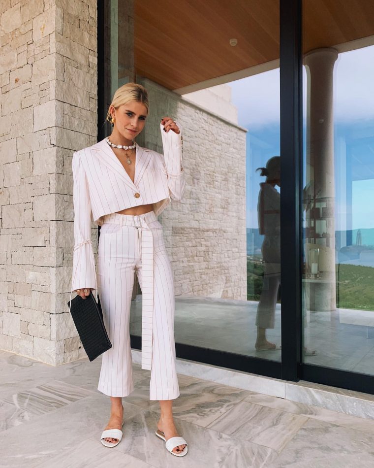 Разрушая все стереотипы, первые модницы сегодня делают ставку на белый total look. Нет, белый не полнит – и доказательство этому Хейли Бибер, одетая в свободные брюки и жакет оверсайз.