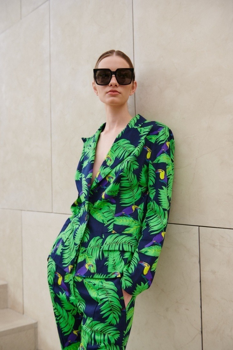 Именно этим принтом специально для ЦУМа Юлия украсила элегантные брючные костюмы и платье нежного молочного оттенка. Также в капсулу вошли сарафан с разноцветными «каплями» и платье с живописными туканами. Как обычно, все вещи создаются в единственном экземпляре.