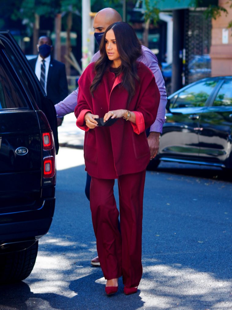 Меган Маркл прогуливается по Лос-Анджелесу в вишневом костюме-двойке Loro Piana, Белла Хадид в клетчатом костюме спешит на свидание, а королева Испании Летиция выбирает лавандовый костюм Bleis Madrid для встречи с журналистами.