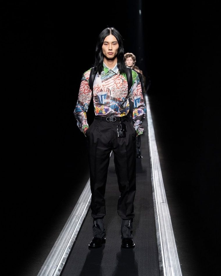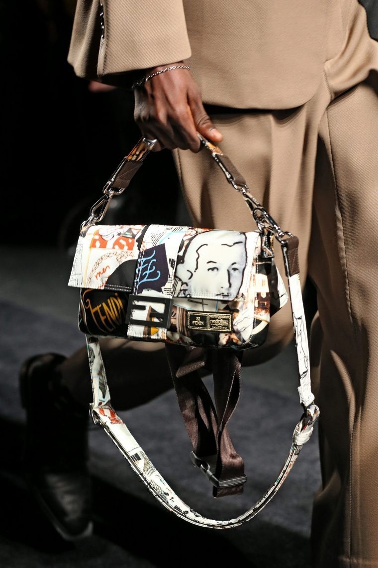 На показе Fendi в качестве приглашенного художника принял участие Карл Лагерфельд. Шоу запомнилось и мужской версией знаменитой сумки «багет». Объект желания для всех модников и модниц!