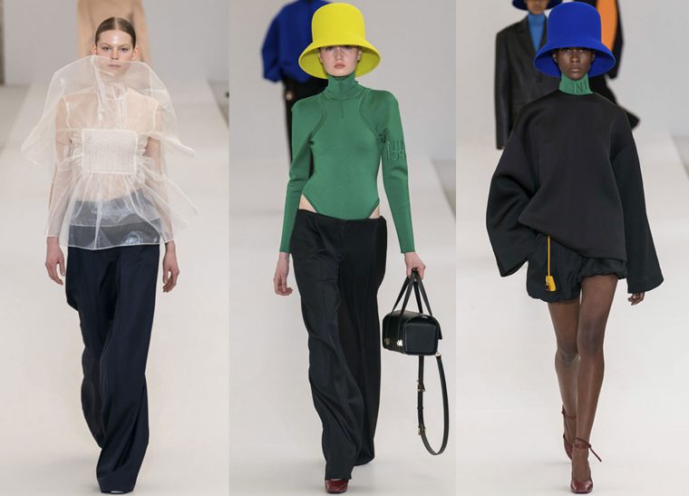 Однако и брючные костюмы, и платья-сорочки, и спортивные трико, напоминающие архивные корсеты Nina Ricci, и объемные овальной формы топы – все странным образом выглядело по-французски элегантно, легко и безусловно женственно, в том самом классическом смысле этого слова. Ну а традиционное для дома сочетание базовых бежевого и черного с яркими пятнами желтого, зеленого и синего звучит по-спортивному бодро и современно.