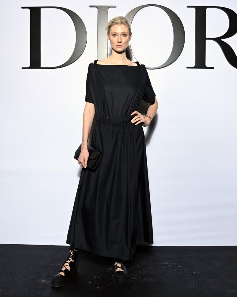 Одно из последних ее эффектных появлений – на показе коллекции Dior весна‒лето 2022, куда актриса пришла в черном платье в пол с открытыми плечами и балетках на шнуровке.