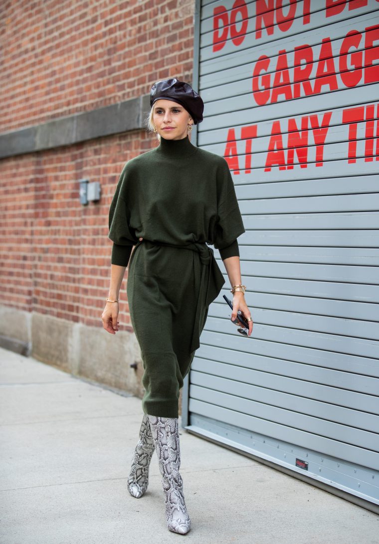 Главная любительница трикотажных платьев – популярный фэшн-блогер с двумя миллионами подписчиков Каролина Даур. Это во время марафона недель мод эта эффектная блондинка поражает замысловатыми образами с кожаными шортами и асимметричными жакетами (читайте ее эксклюзивное интервью для Sportchic), а в будни с удовольствием носит трикотажные платья – однотонные и в рубчик.