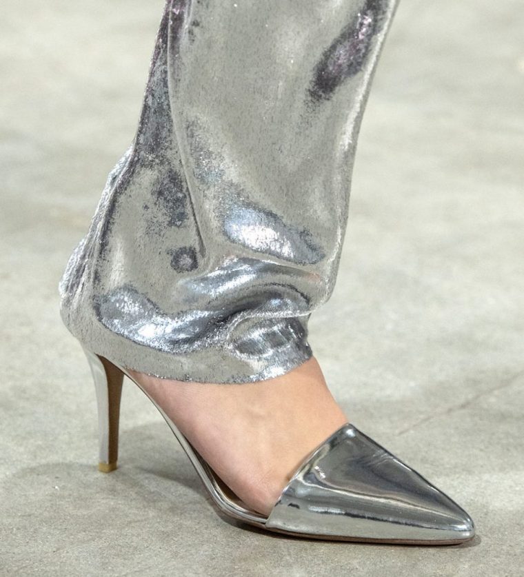 Выбор герцогини Сассекской пал на гибрид мюлей и туфель д’Орсе: черного цвета в едва заметный горошек на каблучке-рюмочке. Похожие пары включили в свои коллекции весна–лето 2019 многие марки, а на подиумах осень–зима 2019/2020 их показали Dior, Dolce & Gabbana, Helmut Lang, Giorgio Armani.