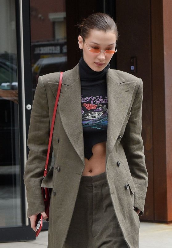 Главное, чему стоит поучиться у Беллы, – выглядеть сексуально не в мини, а в мешковатых брюках и кроссовках. Секрет успеха – в кроп-топах, которые младшая Хадид надевает вместо блузки и свитера под жакет, бомбер и даже под пальто, чтобы продемонстрировать идеальный пресс.
