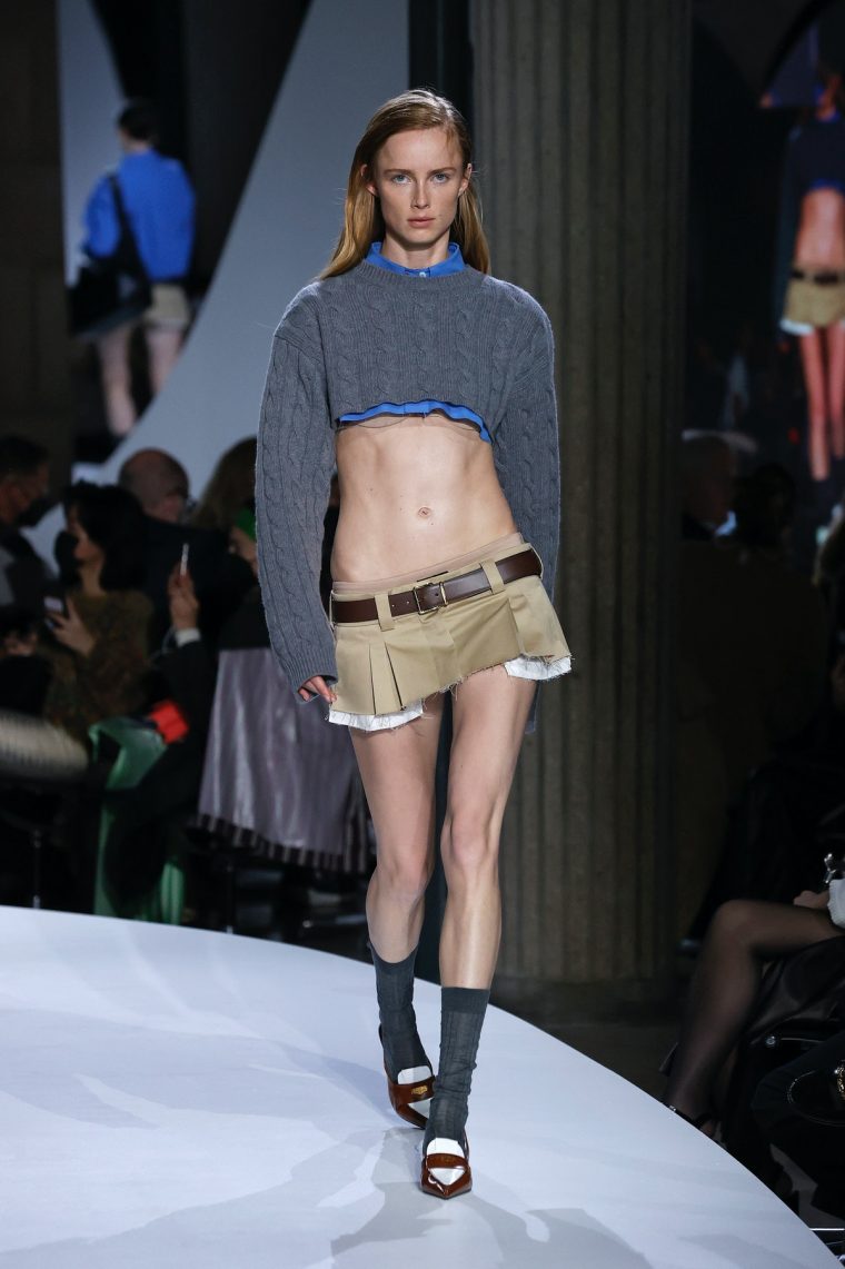 Miu Miu представили массу вещей с низкой посадкой: от брюк-клеш до юбок в складку, которые когда-то носили Бритни Спирс и Пэрис Хилтон. Dolce & Gabbana – джинсы, из которых будто выглядывают стринги, Versace и Prada – мини-юбки, а Blumarine и Boss даже спортивные брюки спустили на тазовые косточки.