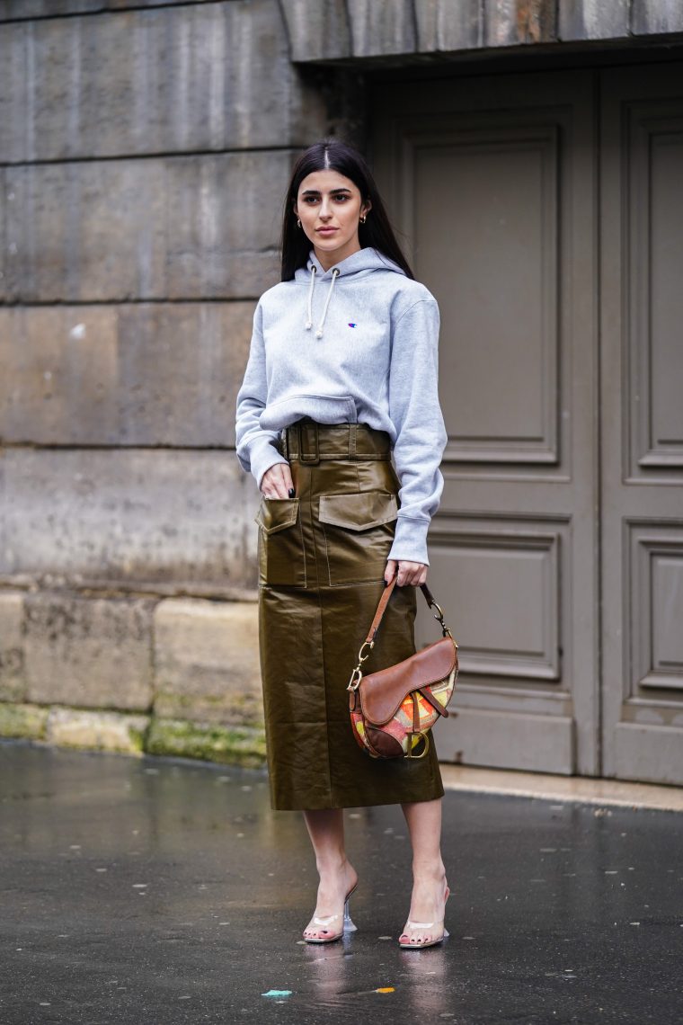 Наш любимый стиль спортшик. Худи можно даже заправить в юбку, как рубашку, или оставить навыпуск. Круче всего такой наряд будет смотреться в паре с полупрозрачными черными колготками и грубыми армейскими ботинками, как носит Белла Хадид.