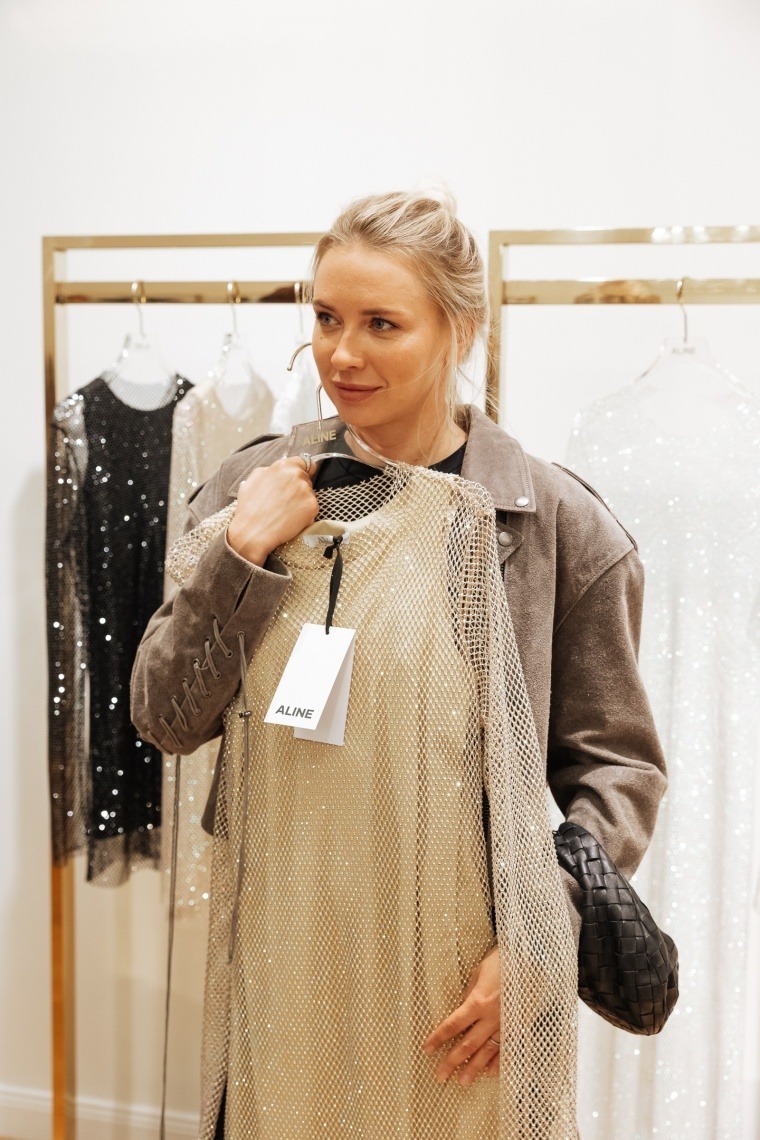 Основательница и креативный директор бренда Алина Нехай, в прошлом успешный байер, представила вечерние и коктейльные платья, а также повседневную одежду из кожи, денима и кашемира.