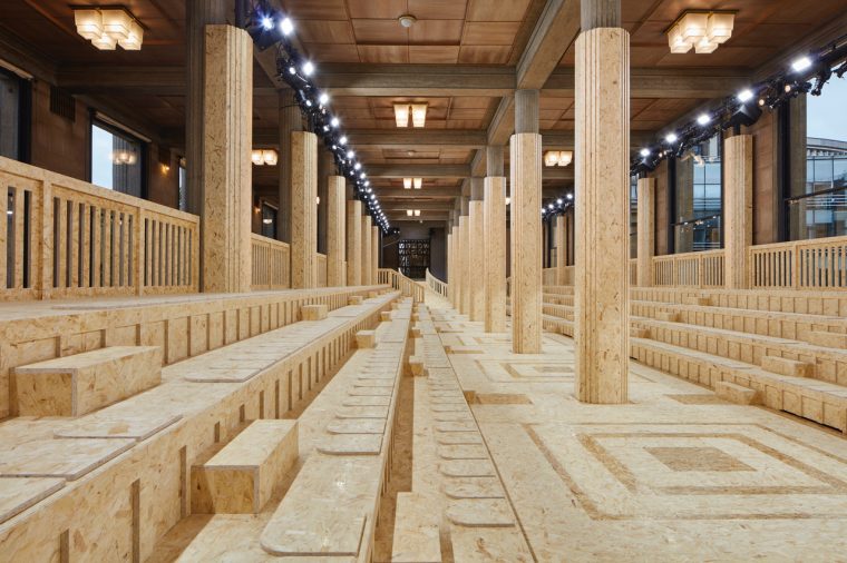 Для показа Miu Miu была установлена занимающая всепространство инсталляция, выполненная из древесины ОСП. После показа она была передана для дальнейшего использования студентам в сфере искусства.