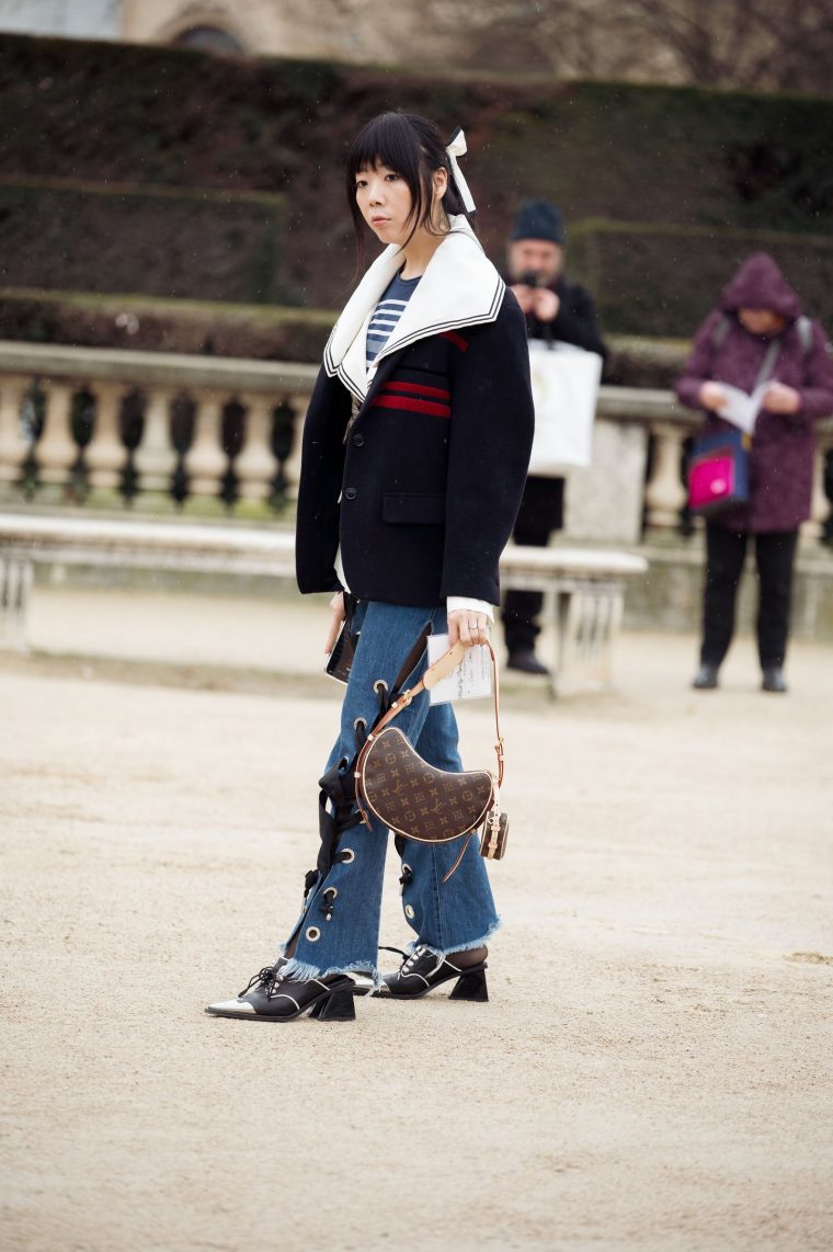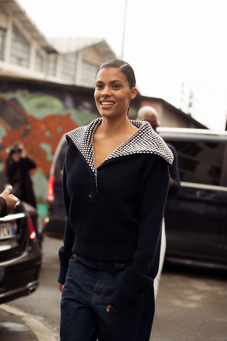 И вот уже Тина Кунаки щеголяет перед показом Gucci в темно-синей шерстяном свитере-матроске с воротником, расшитым стразами. А Сьюзи Лау на Парижской неделе моды носит матроску Miu Miu с объемным блейзером и джинсами.