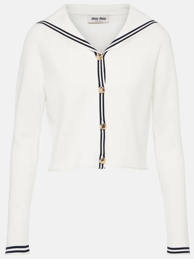 Матроски-кардиганы Miu Miu – классического белого цвета с изящными синими полосками и логотипом итальянского дома на воротнике.
