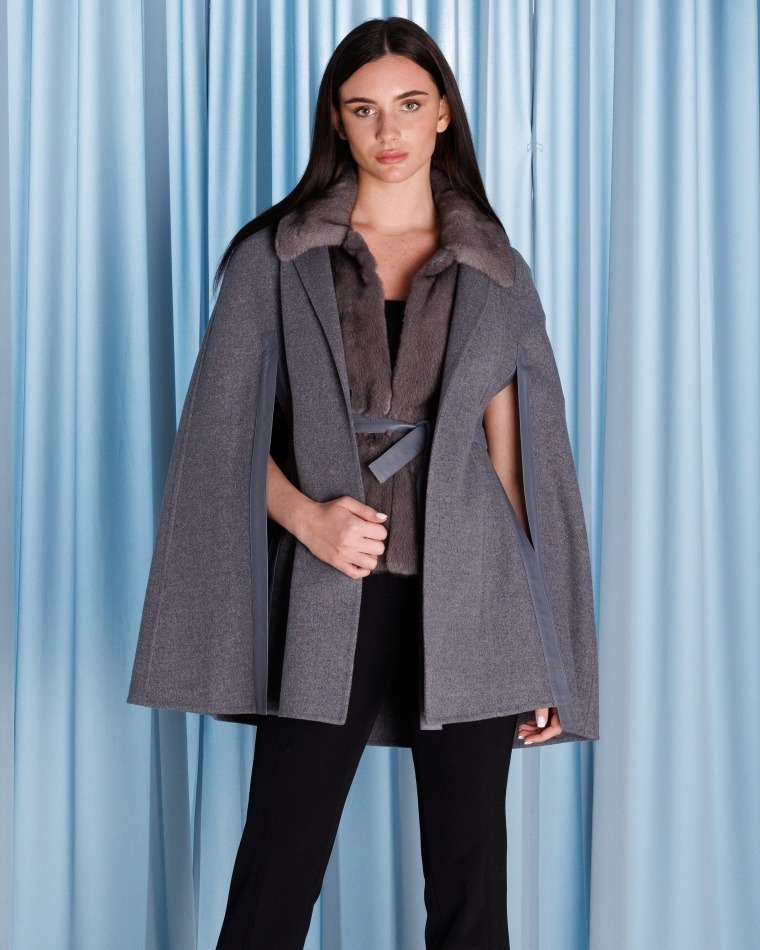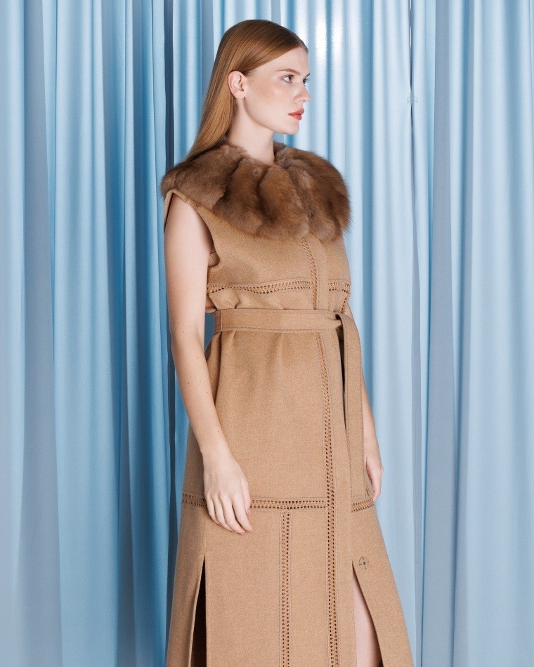 Обратите внимание на пальто Re Look Furs из каракульчи редкого натурального золотого оттенка nаmibia gold, также жакеты из кашемира бежевого и коричневого оттенков. Помимо натуральных цветов актуальны и яркие – голубой, синий, зеленый и красный «вива мажента».
