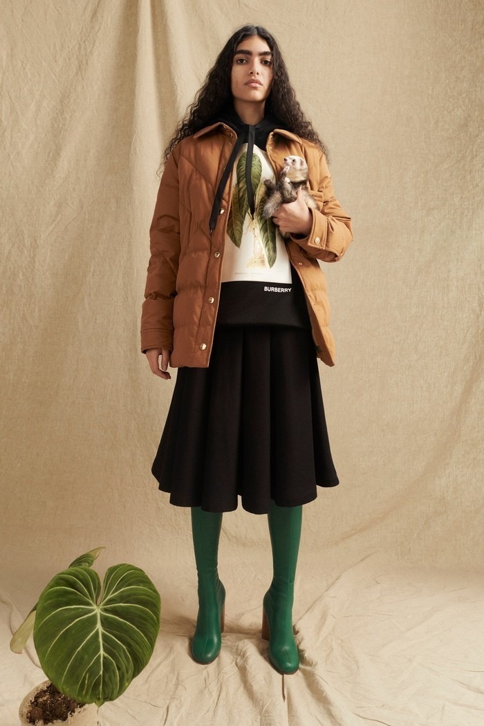 В нее вошли теплые парки, уютные свитера и рубашки в приглушенных землистых оттенках. Вещи украшены принтами в виде зеленых листьев, а в рекламной кампании модели позируют с живыми хорьками на руках.