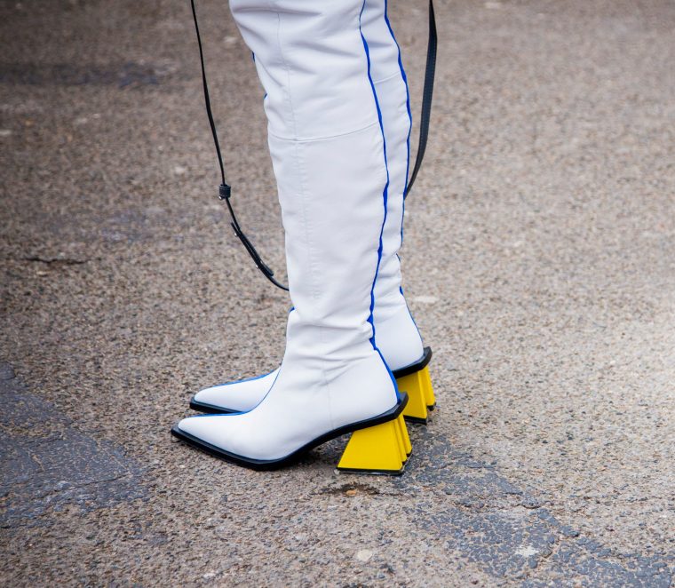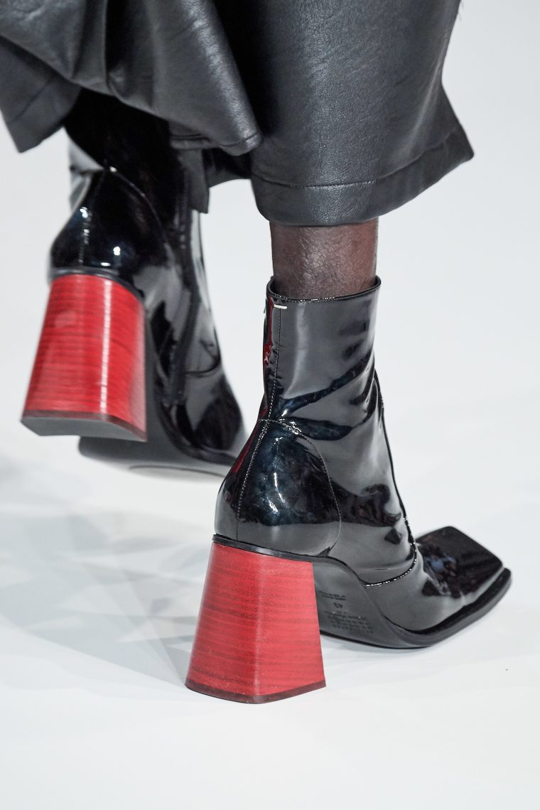 Например, квадратный каблук может быть попросту другого цвета, как в коллекциях Proenza Schouler и Nina Ricci, металлическим, как у A.W.A.K.E, в виде спирали, как у Balmain, меховым, как у Maison Margiela, или прозрачным. Причем, такие каблуки могут быть не только у сапогов и ботильонов, Christopher Kane представил даже кроссовки!