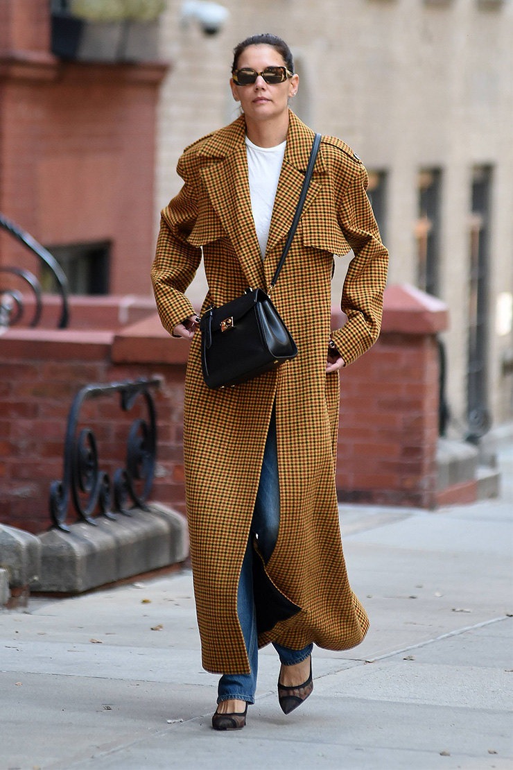 Носите как кроссбоди любую модель: хоть ведро, хоть поясную, хоть микромалышку. Например, актриса Кэти Холмс и вовсе носит на длинной ручке через плечо сумку-саквояж.