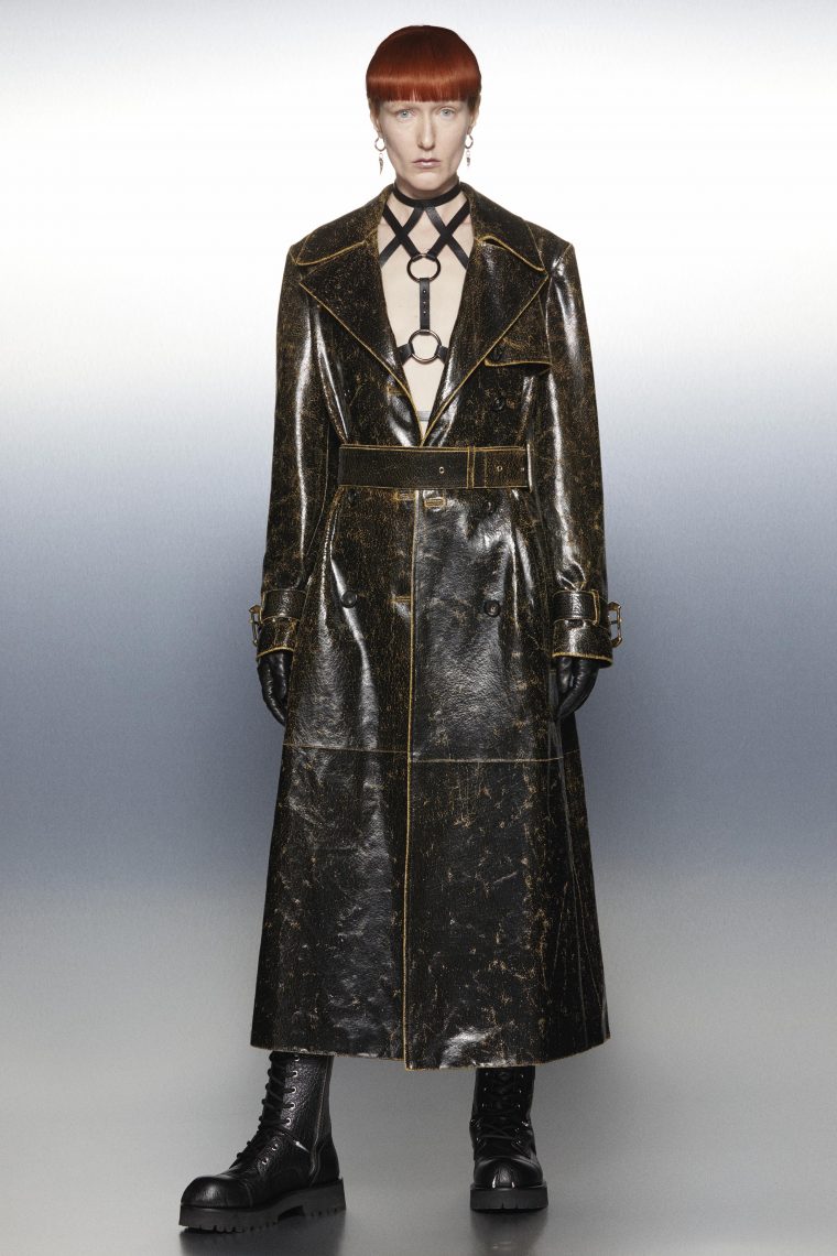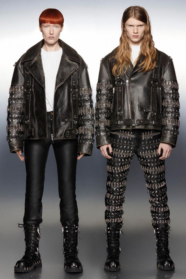 Пиджаки с кожаными деталями, куртки-косухи, усыпанные булавками, свитшоты со шнуровкой, платья, будто созданные из жидкого металла, и главный аксессуар коллекции – кожаные портупеи.