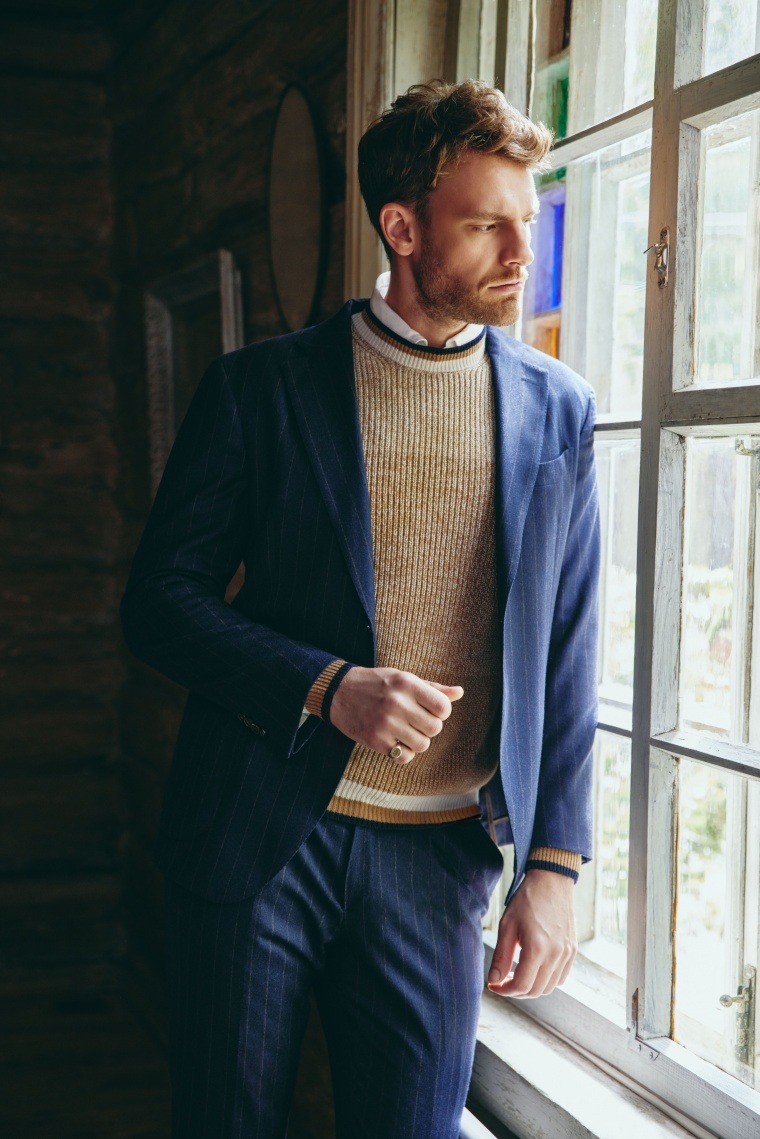 Представлены и мужские вещи. Кардиганы с принтом и костюмы из шерсти Lardini, пальто в елочку Massimo Alba, джемперы Peserico и деним Agnona.